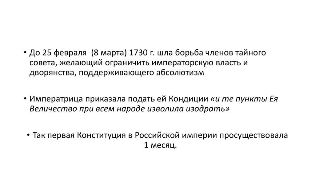 • До 25 февраля (8 марта) 1730 г. шла борьба членов тайногосовета, желающий ограничить императорскую власть и
