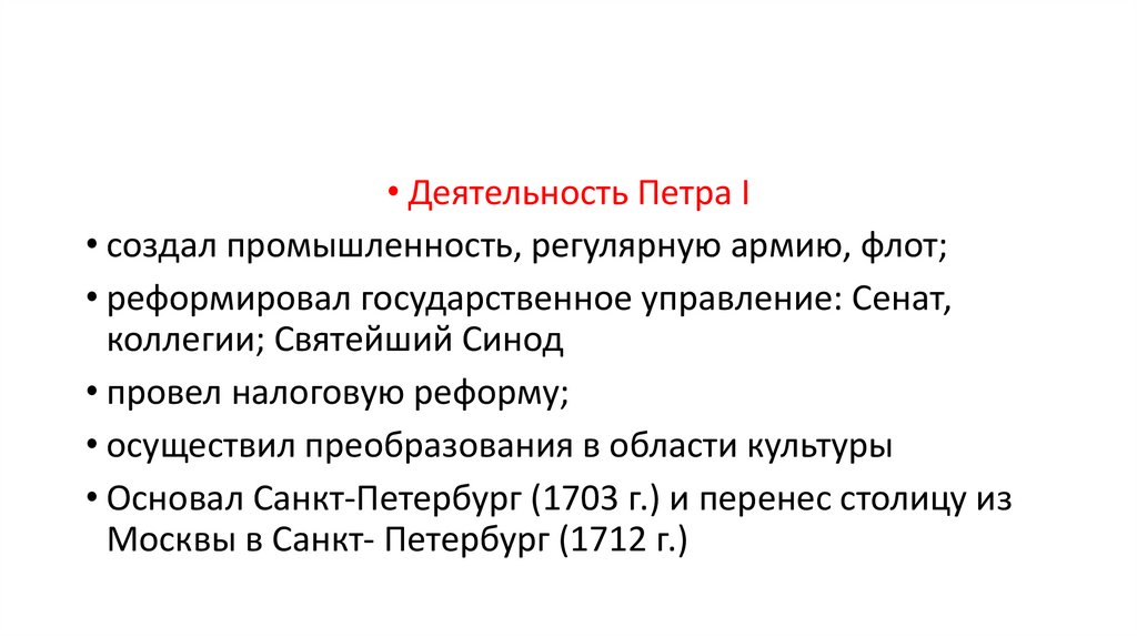 • Основал Санкт-Петербург (1703 г.) и перенес столицу из
