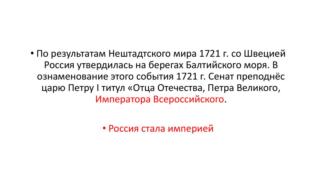 • По результатам Нештадтского мира 1721 г. со ШвециейРоссия утвердилась на берегах Балтийского моря. В