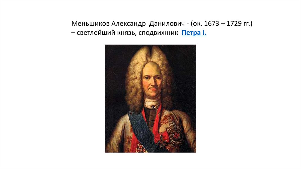 Меньшиков Александр Данилович - (ок. 1673 – 1729 гг.)– светлейший князь, сподвижник Петра I.