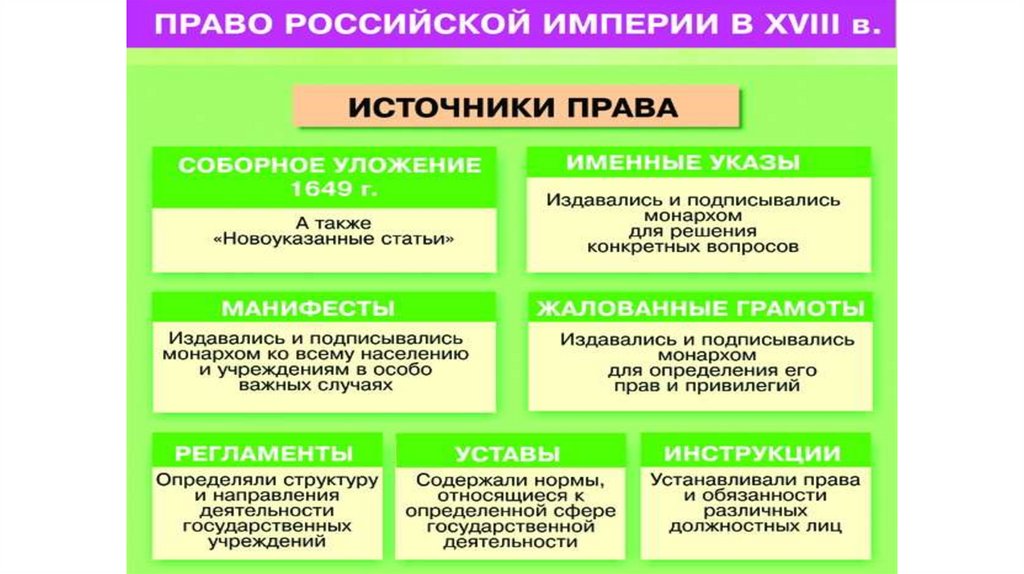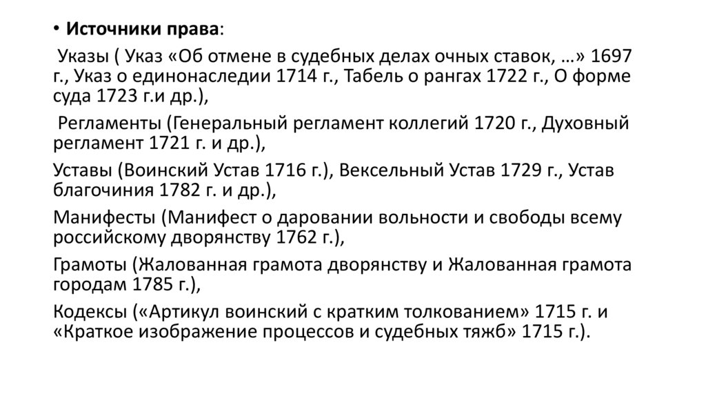• Источники права:Указы ( Указ «Об отмене в судебных делах очных ставок, …» 1697