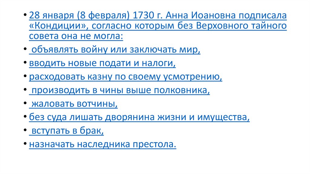 • 28 января (8 февраля) 1730 г. Анна Иоановна подписала«Кондиции», согласно которым без Верховного тайного