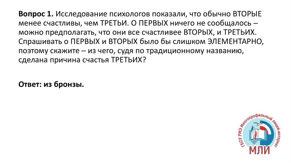 Вопрос 1. Исследование психологов показали, что обычно ВТОРЫЕменее счастливы, чем ТРЕТЬИ. О ПЕРВЫХ ничего не сообщалось ─