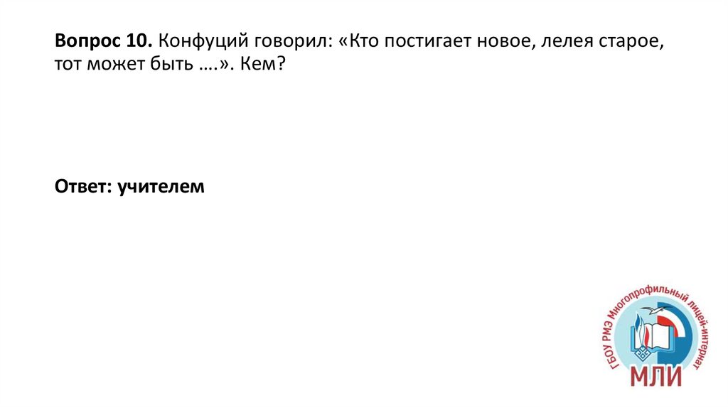 Вопрос 10. Конфуций говорил: «Кто постигает новое, лелея старое,тот может быть ….». Кем?