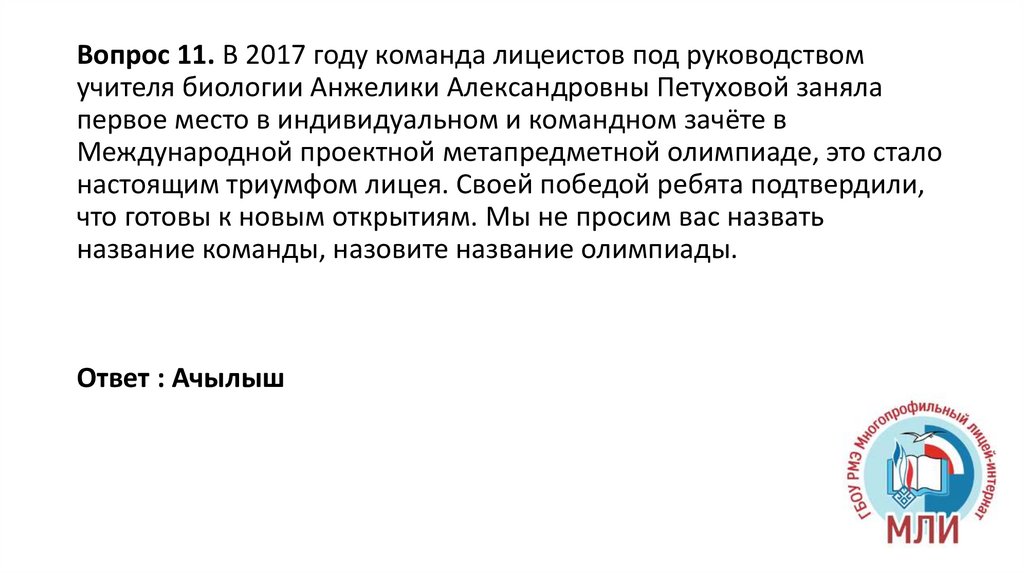 Вопрос 11. В 2017 году команда лицеистов под руководствомучителя биологии Анжелики Александровны Петуховой заняла