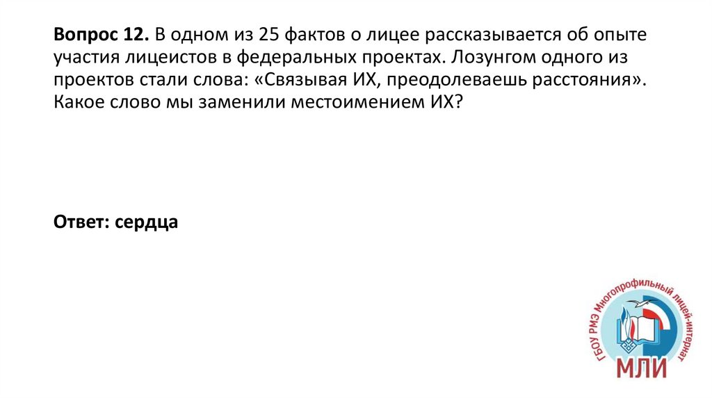 Вопрос 12. В одном из 25 фактов о лицее рассказывается об опытеучастия лицеистов в федеральных проектах. Лозунгом одного из