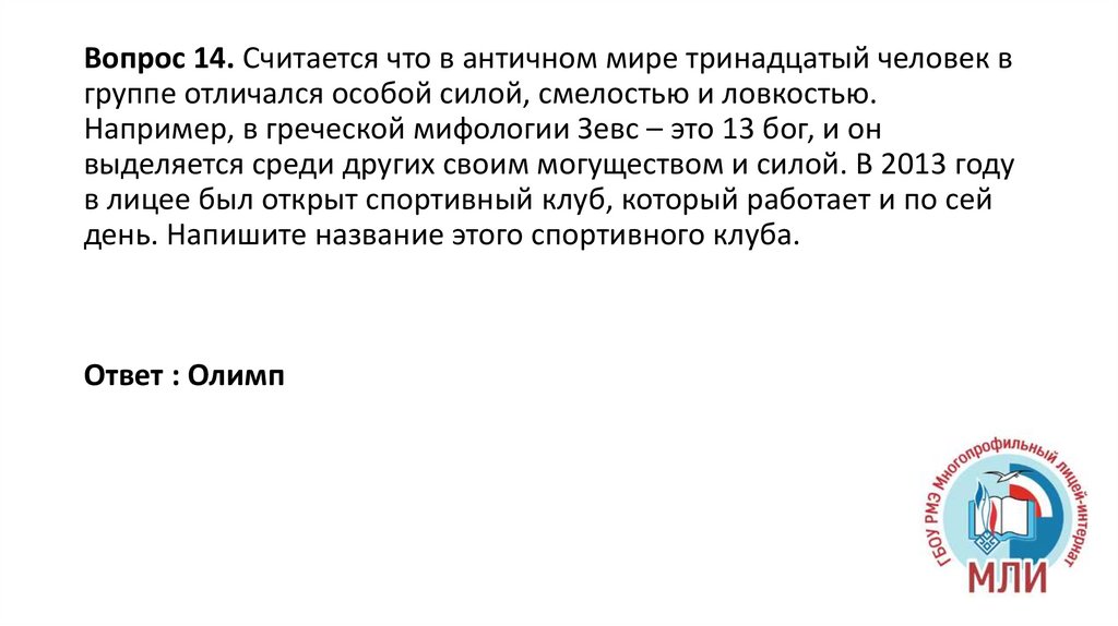 Вопрос 14. Считается что в античном мире тринадцатый человек вгруппе отличался особой силой, смелостью и ловкостью.