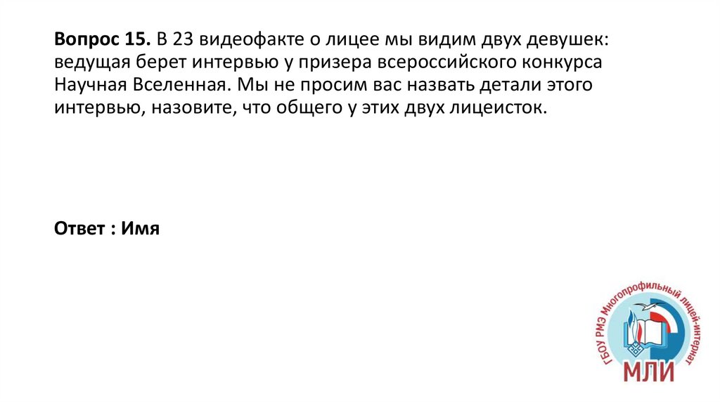 Вопрос 15. В 23 видеофакте о лицее мы видим двух девушек:ведущая берет интервью у призера всероссийского конкурса
