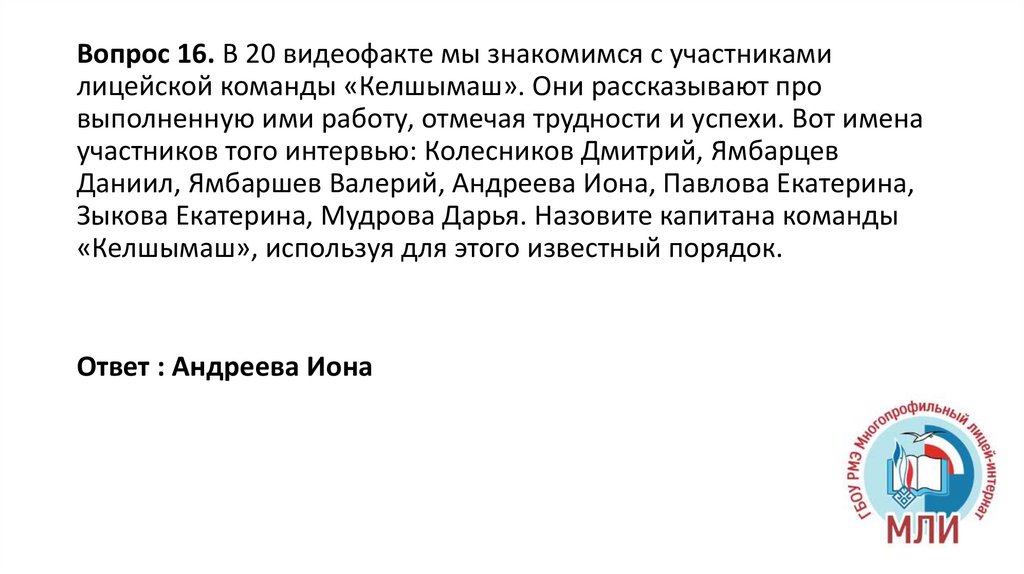 Вопрос 16. В 20 видеофакте мы знакомимся с участникамилицейской команды «Келшымаш». Они рассказывают про