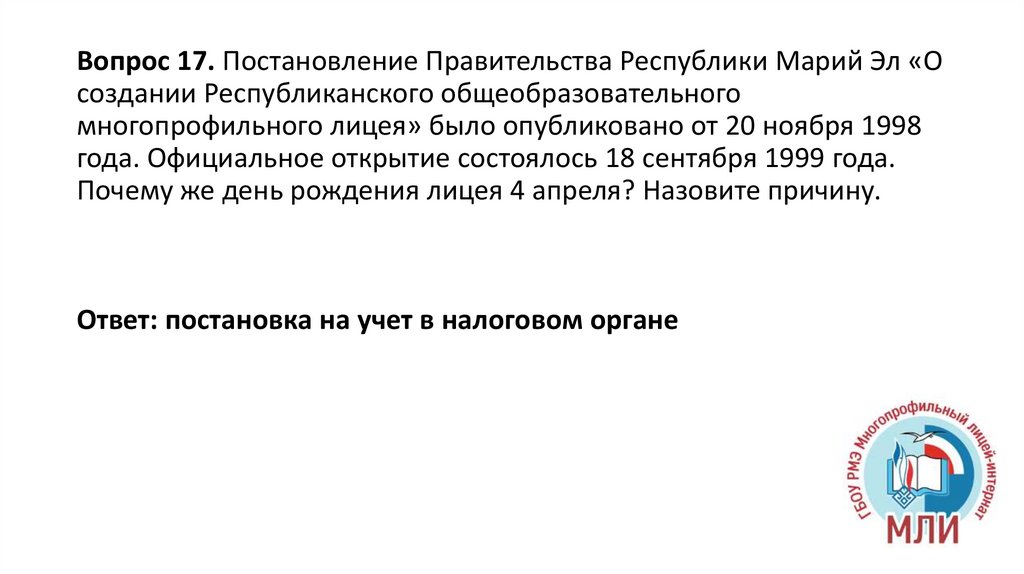Вопрос 17. Постановление Правительства Республики Марий Эл «Осоздании Республиканского общеобразовательного