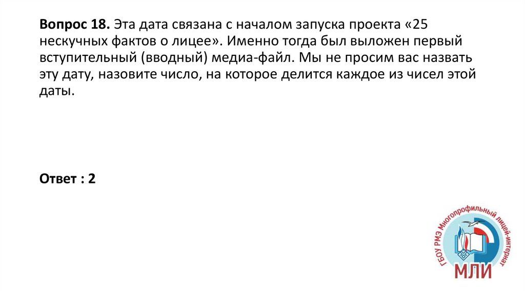 Вопрос 18. Эта дата связана с началом запуска проекта «25нескучных фактов о лицее». Именно тогда был выложен первый