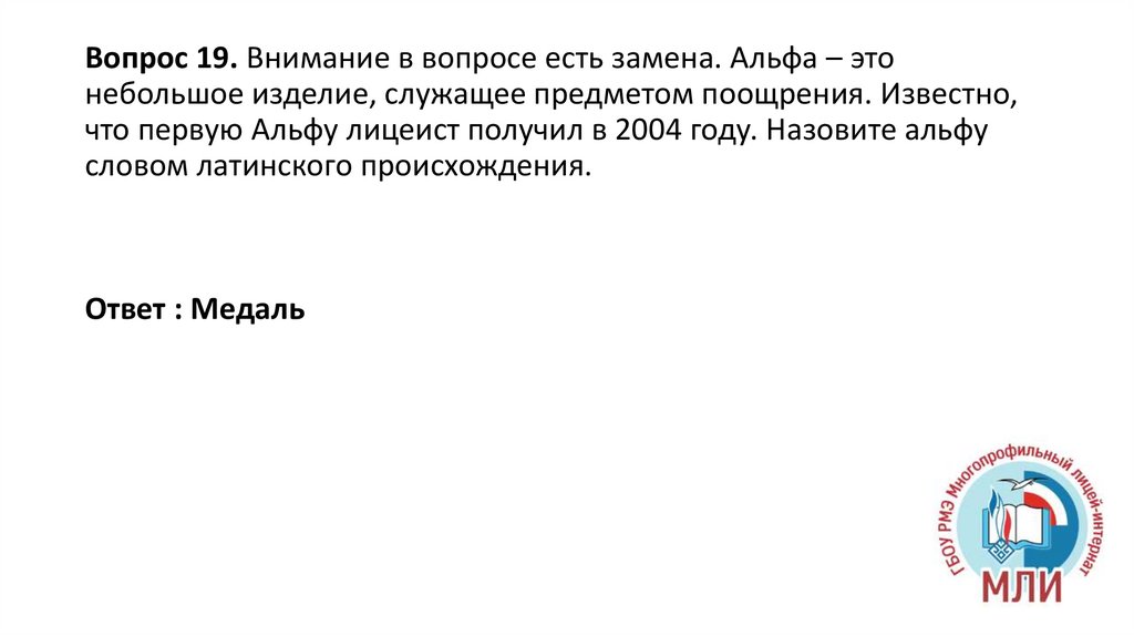 Вопрос 19. Внимание в вопросе есть замена. Альфа – этонебольшое изделие, служащее предметом поощрения. Известно,