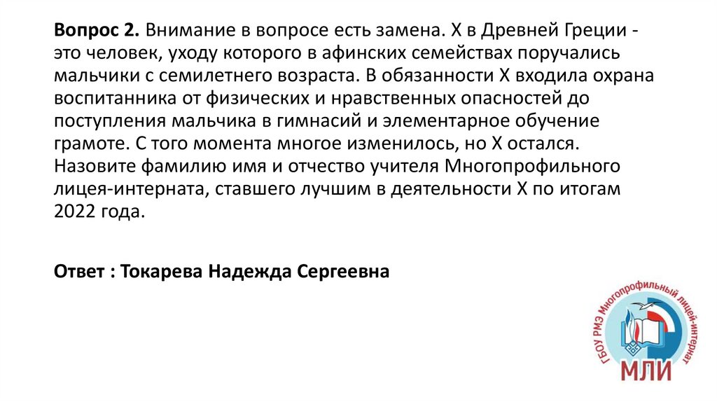 Вопрос 2. Внимание в вопросе есть замена. X в Древней Греции это человек, уходу которого в афинских семействах поручалисьмальчики с семилетнего возраста. В обязанности Х входила охрана