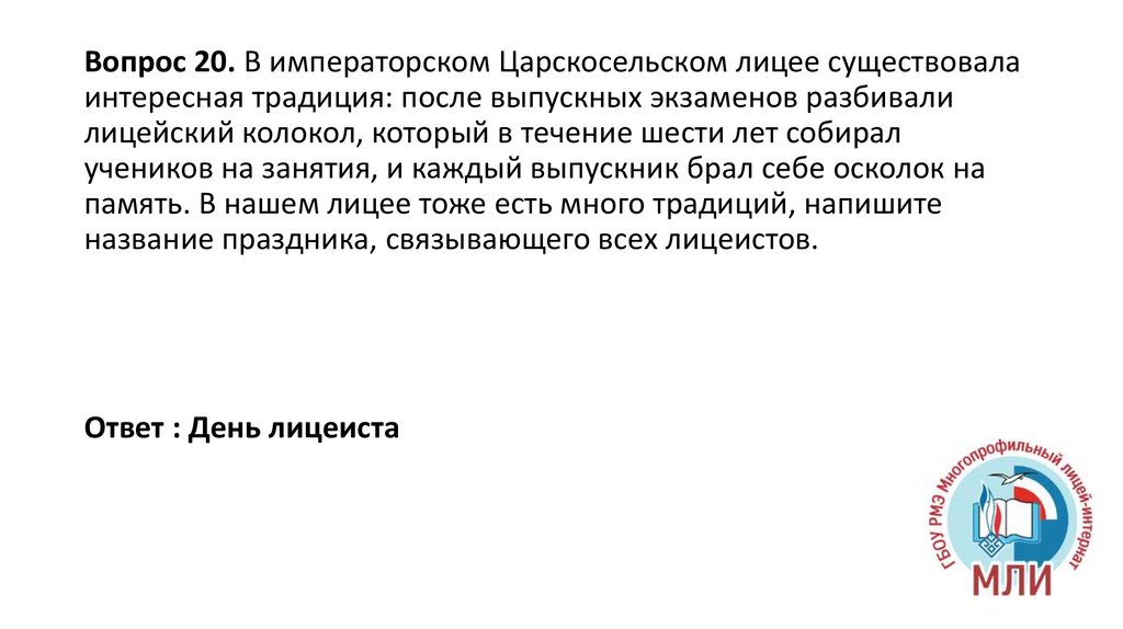 Вопрос 20. В императорском Царскосельском лицее существовалаинтересная традиция: после выпускных экзаменов разбивали