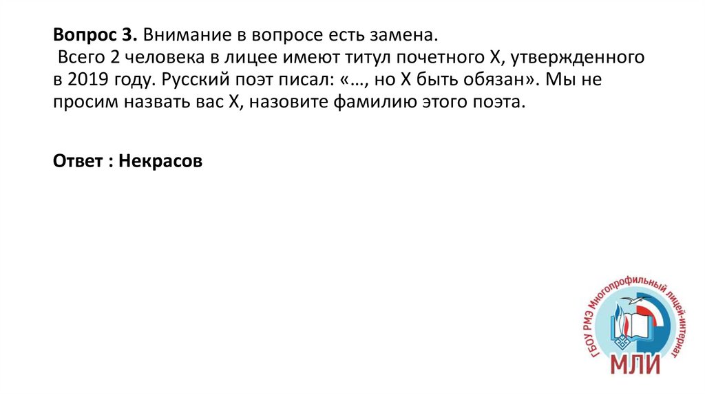Вопрос 3. Внимание в вопросе есть замена.Всего 2 человека в лицее имеют титул почетного Х, утвержденного