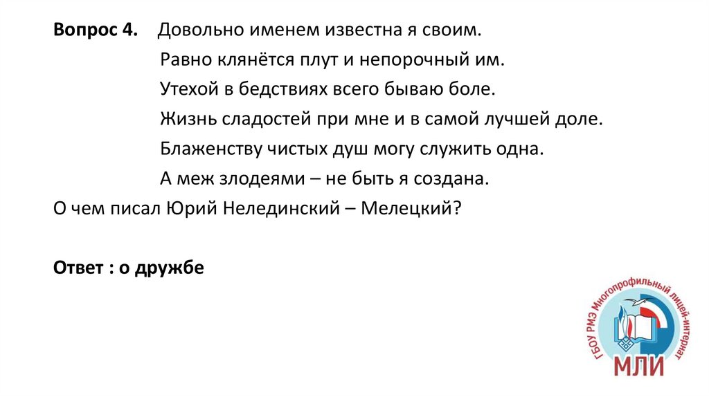 Вопрос 4. Довольно именем известна я своим.Равно клянётся плут и непорочный им.