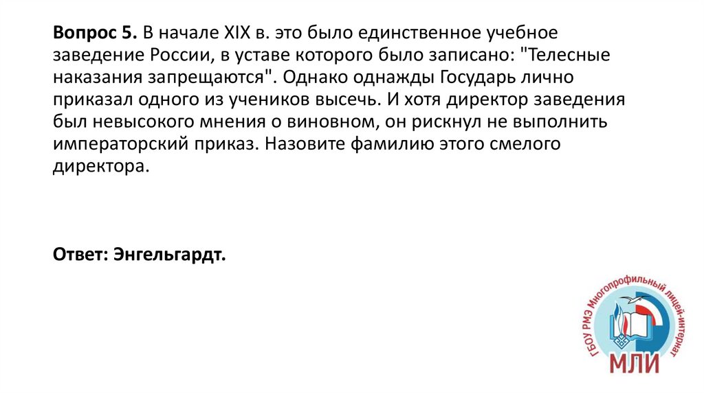 Вопрос 5. В начале XIX в. это было единственное учебноезаведение России, в уставе которого было записано: "Телесные
