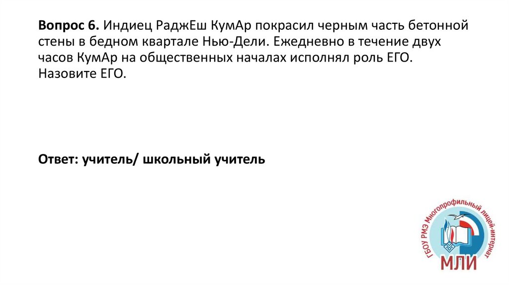Вопрос 6. Индиец РаджЕш КумАр покрасил черным часть бетоннойстены в бедном квартале Нью-Дели. Ежедневно в течение двух