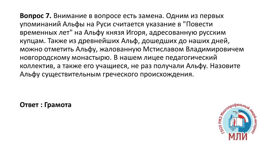 Вопрос 7. Внимание в вопросе есть замена. Одним из первыхупоминаний Альфы на Руси считается указание в "Повести