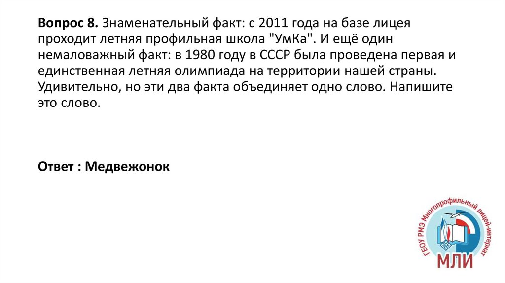 Вопрос 8. Знаменательный факт: с 2011 года на базе лицеяпроходит летняя профильная школа "УмКа". И ещё один
