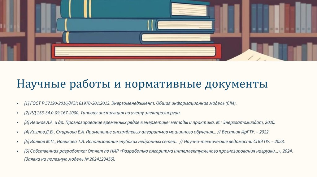 [3] Иванов А.А. и др. Прогнозирование временных рядов в энергетике: методы и практика. М.: Энергоатомиздат, 2020.