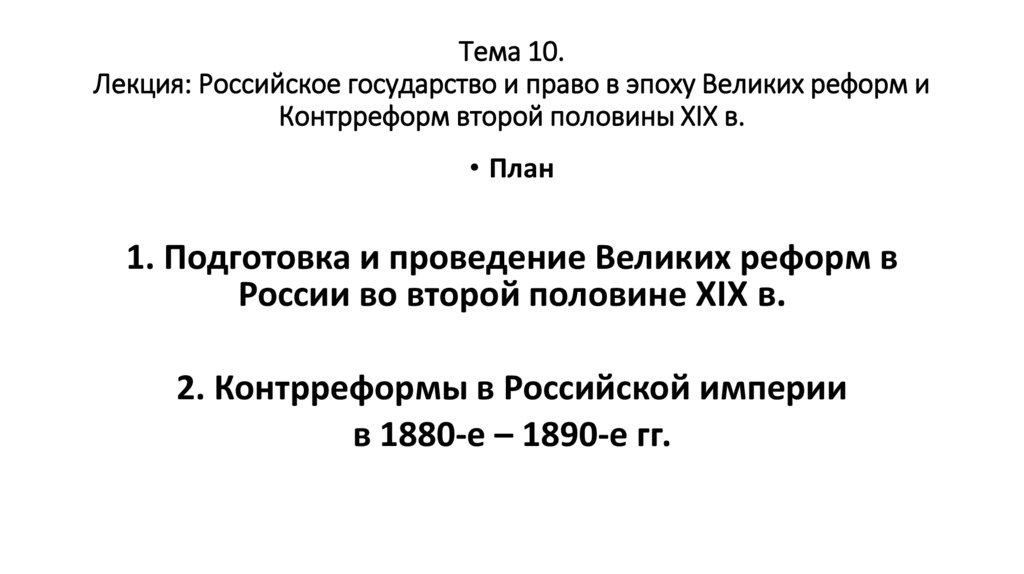1. Тема 10. Лекция: Российское государство и право в эпоху Великих реформ и Контрреформ второй половины XIX в.
