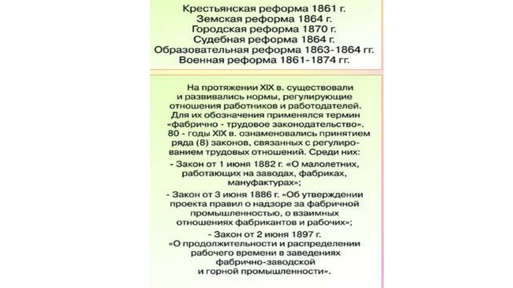 16. 19 февраля 1861 года: -«Манифест освобождении помещичьих крестьян из крепостной зависимости» - «Положения о крестьянах вышедших