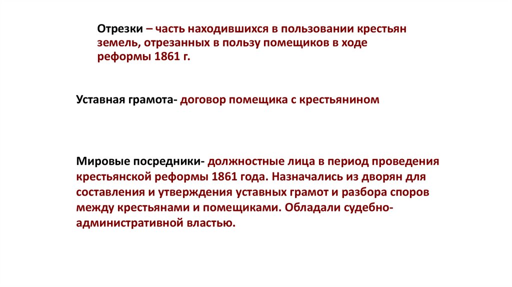 Отрезки – часть находившихся в пользовании крестьянземель, отрезанных в пользу помещиков в ходе