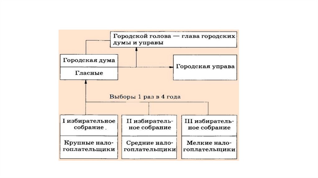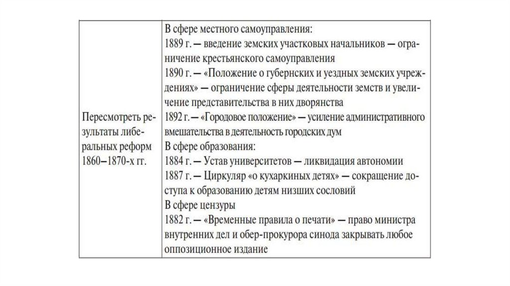 • 1. Ограничение земского и городскогосамоуправления (с 1889 г. – введение земских
