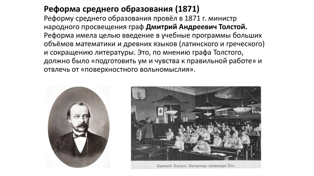 Реформа среднего образования (1871)Реформу среднего образования провёл в 1871 г. министр
