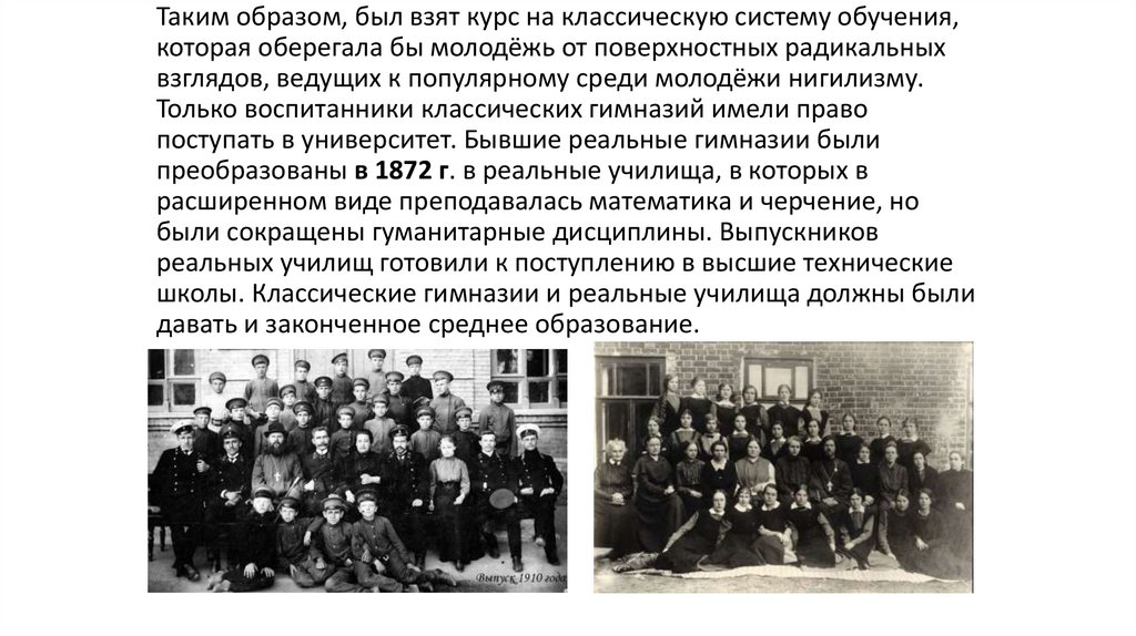 Таким образом, был взят курс на классическую систему обучения,которая оберегала бы молодёжь от поверхностных радикальных