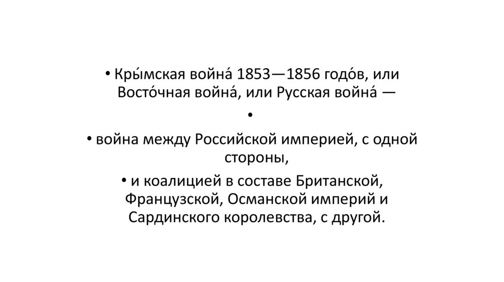 • Кры́ мская война́ 1853—1856 годо́в, илиВосто́чная война́, или Русская война́ —