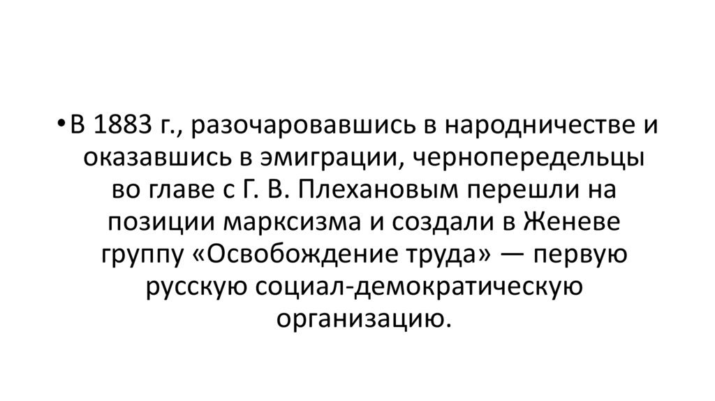 • В 1883 г., разочаровавшись в народничестве иоказавшись в эмиграции, чернопередельцы