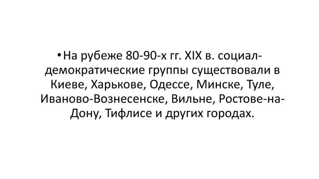• На рубеже 80-90-х гг. ХIХ в. социалдемократические группы существовали вКиеве, Харькове, Одессе, Минске, Туле,