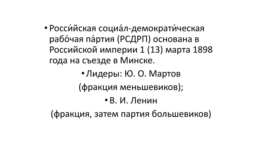 • Росси́ йская социа́л-демократи́ ческаярабо́чая па́ртия (РСДРП) основана в
