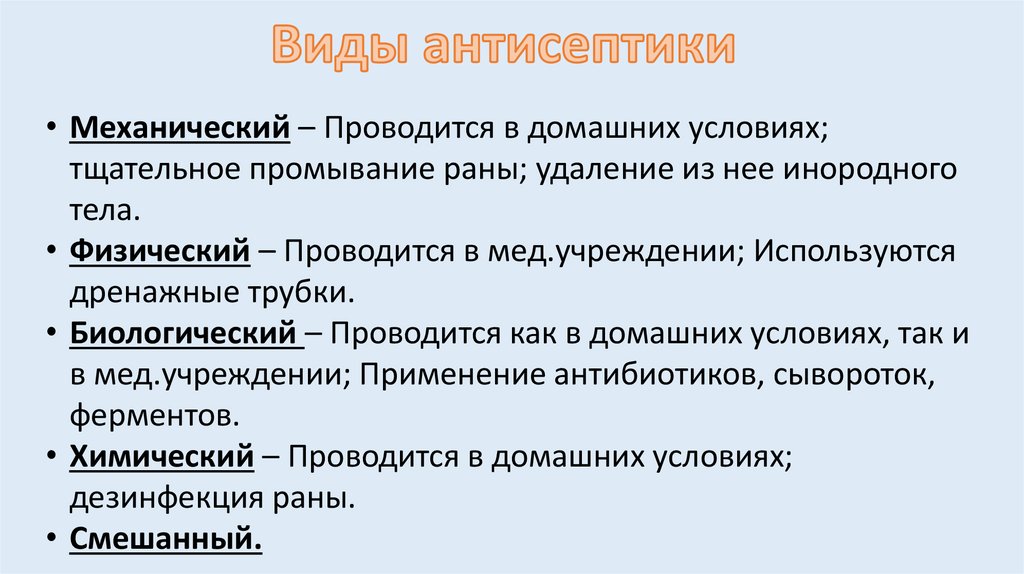 • Механический – Проводится в домашних условиях;тщательное промывание раны; удаление из нее инородного