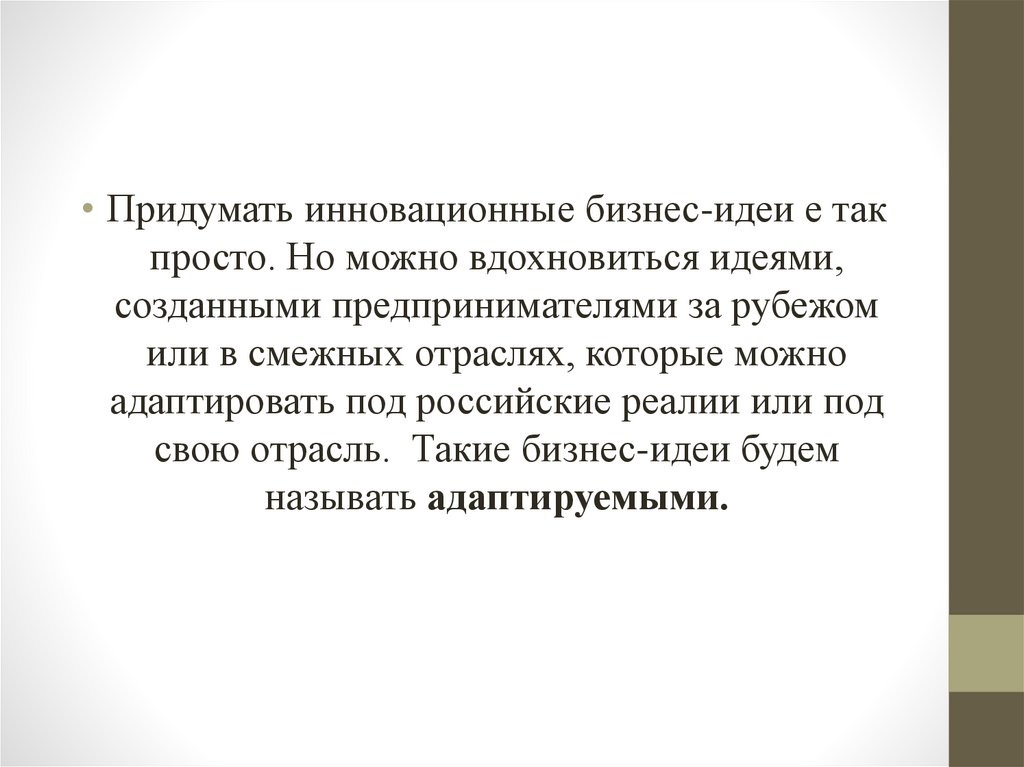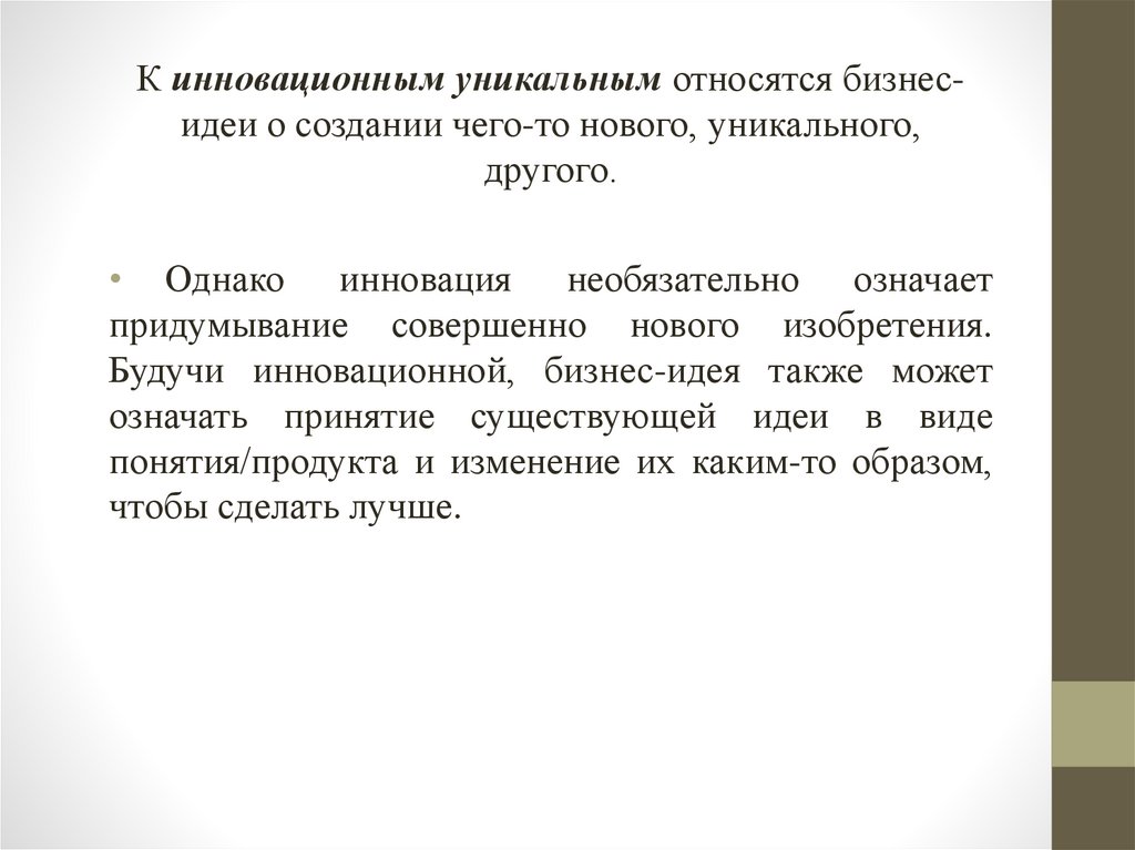 К инновационным уникальным относятся бизнесидеи о создании чего-то нового, уникального,другого.