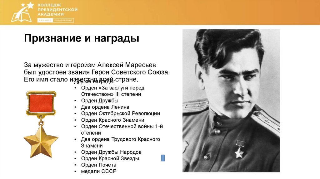 Признание и наградыЗа мужество и героизм Алексей Маресьев