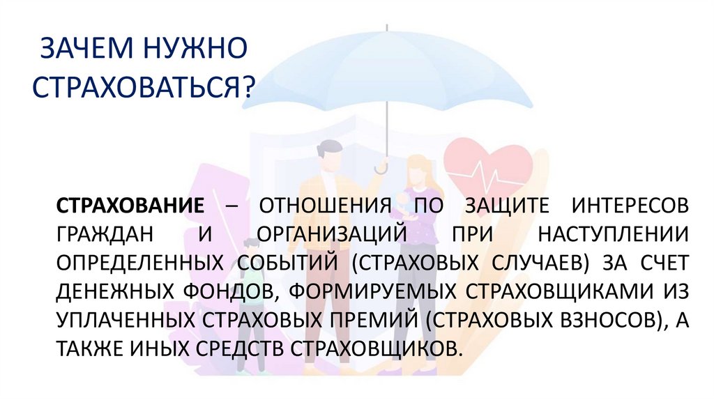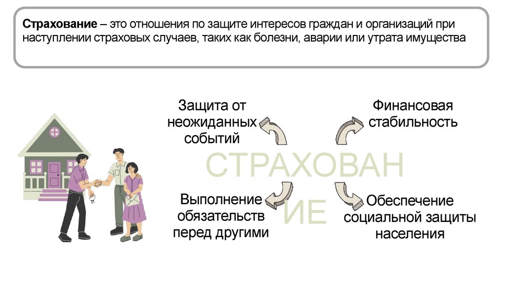 Страхование – это отношения по защите интересов граждан и организаций принаступлении страховых случаев, таких как болезни, аварии или утрата имущества