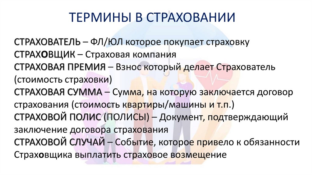 ТЕРМИНЫ В СТРАХОВАНИИСТРАХОВАТЕЛЬ – ФЛ/ЮЛ которое покупает страховку