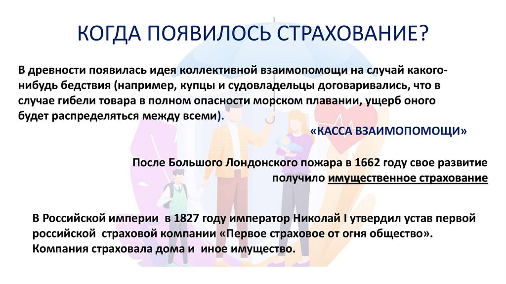КОГДА ПОЯВИЛОСЬ СТРАХОВАНИЕ?В древности появилась идея коллективной взаимопомощи на случай какогонибудь бедствия (например, купцы и судовладельцы договаривались, что в