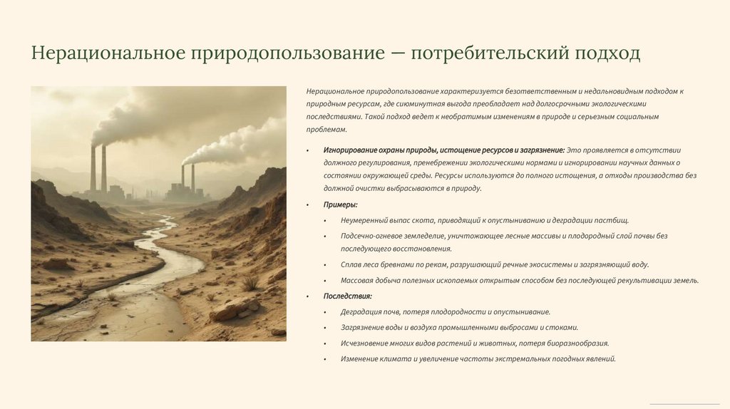 Нерациональное природопользование — потребительский подходНерациональное природопользование характеризуется безответственным и недальновидным подходом к