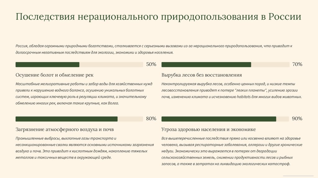 Последствия нерационального природопользования в РоссииРоссия, обладая огромными природными богатствами, сталкивается с серьезными вызовами из-за нерационального природопользования, что приводит к