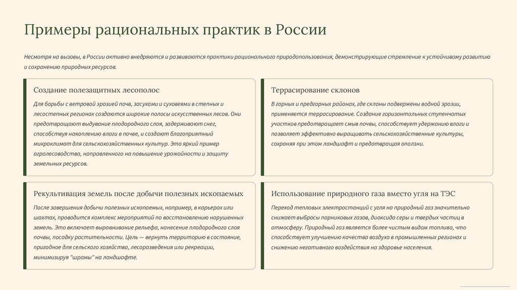 Примеры рациональных практик в РоссииНесмотря на вызовы, в России активно внедряются и развиваются практики рационального природопользования, демонстрирующие стремление к устойчивому развитию