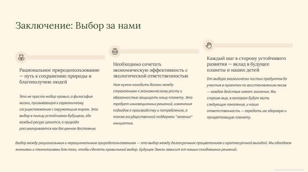 Выбор между рациональным и нерациональным природопользованием — это выбор между долгосрочным процветанием и краткосрочной выгодой. Мы обладаем