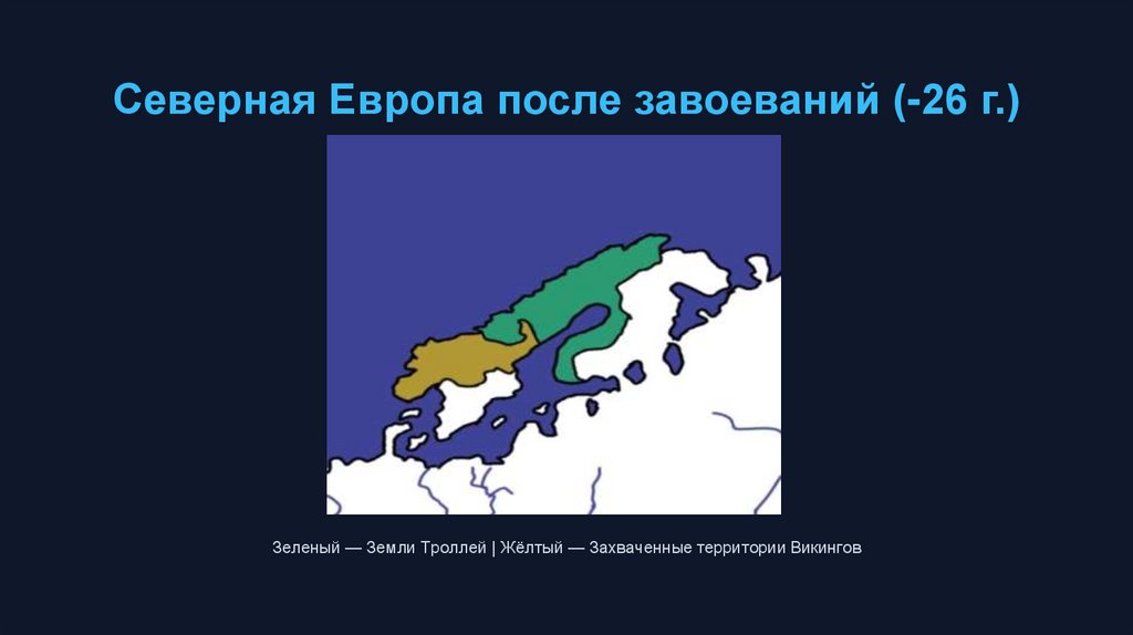 Северная Европа после завоеваний (-26 г.)Зеленый — Земли Троллей | Жёлтый — Захваченные территории Викингов