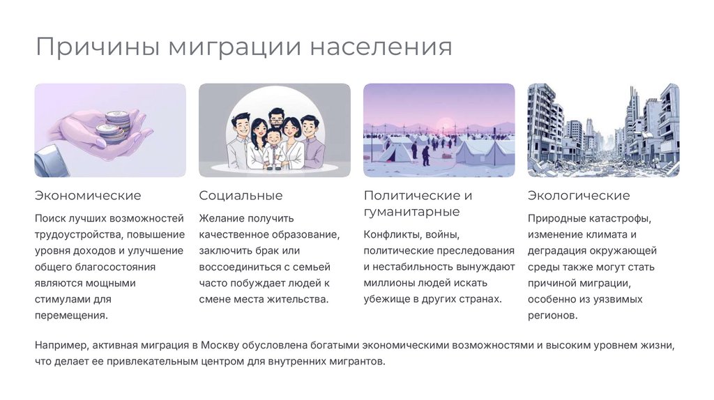 Например, активная миграция в Москву обусловлена богатыми экономическими возможностями и высоким уровнем жизни,