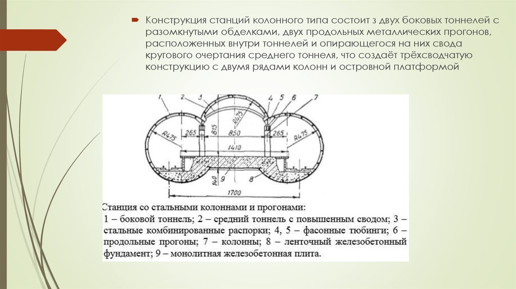 Конструкция станций колонного типа состоит з двух боковых тоннелей сразомкнутыми обделками, двух продольных металлических прогонов,