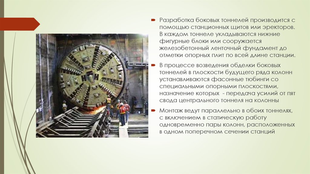 Разработка боковых тоннелей производится спомощью станционных щитов или эректоров.