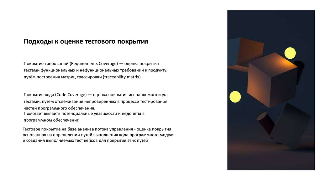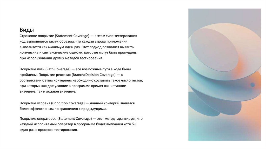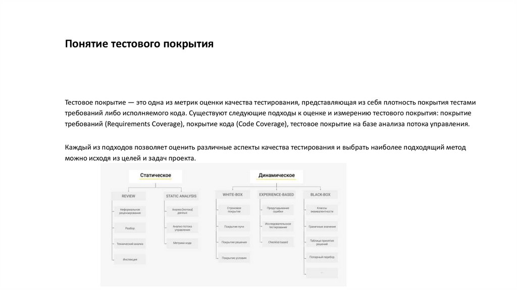 требований (Requirements Coverage), покрытие кода (Code Coverage), тестовое покрытие на базе анализа потока управления.